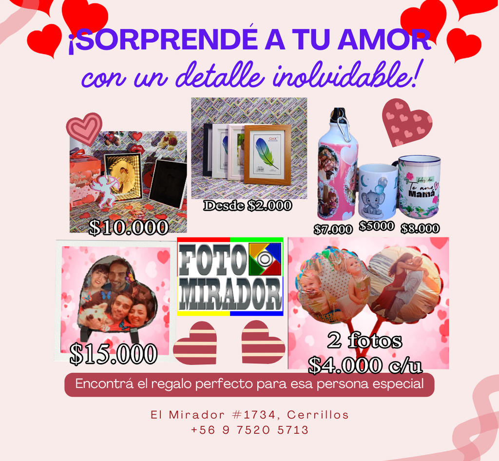 En FOTO MIRADOR nos dedicamos a ofrecer un servicio de revelado de fotografías desde tu celular o cámara digital, garantizando hasta tamaños de 30x40 cm. También proporcionamos una variedad de productos personalizados, como marcos de fotos y tazones cerámicos con tus imágenes favoritas. Nuestro compromiso es realizar cada trabajo con amor y dedicación, asegurando la satisfacción de nuestros clientes en cada producto que ofrecemos.